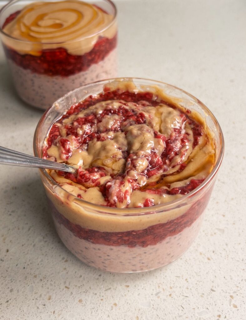 - Layer up your jars, bowls or ramekins with a layer of the overnight oats, chia jam and top with a generous helping of peanut butter. Enjoy!