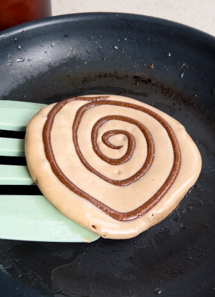 - Using the piping bag, carefully squeeze the cinnamon swirl onto the top of the pancake. When lots of little bubbles are appearing at the top of the pancake, carefully flip it and cook for a couple more minutes until both sides are golden brown.