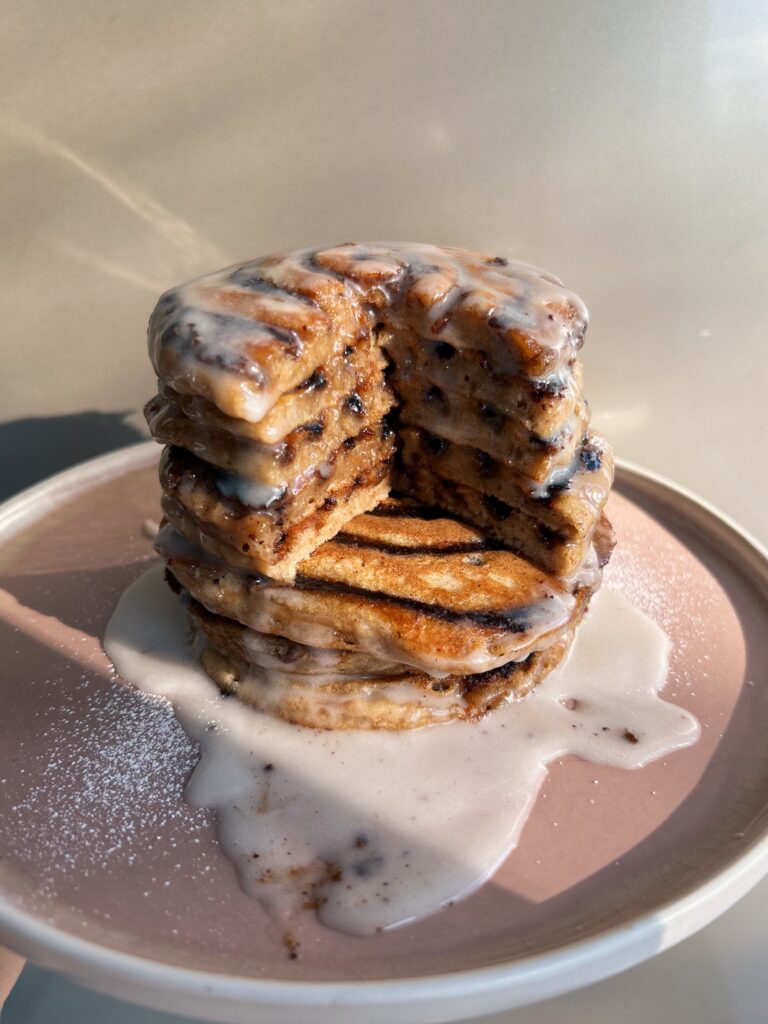 - For the cream cheese glaze, stir the ingredients together in a small bowl until smooth. Drizzle over the pancakes and enjoy!