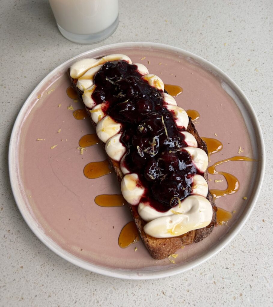 - Ensemble the toasts by adding the whipped tofu to the toasted sourdough slices (I used a piping bag as I was feeling fancy and it looks so pretty!), top with the blueberry compote, lemon zest and a drizzle of syrup. Enjoy!