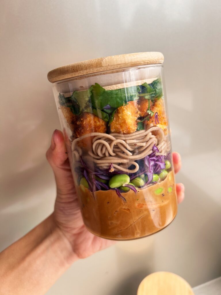 Salad Jars are one of the best ways to meal prep in my opinion. They’re such a great concept because the salad stays fresh until you’re ready to eat and it won’t get soggy. To ensure this is the case, the dressing always goes at the bottom, followed my the least absorbent ingredients (such as carrots, red cabbage, edamame), then grains/noodles/pasta, protein, and leafy greens or herbs at the top.