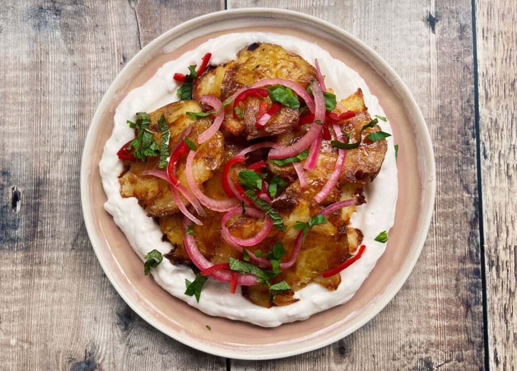 - While they’re cooking, mix together the yoghurt ingredients – taste test and add any seasonings to your preference. Smear over a plate and add your crispy smashed potatoes and all the garnishes. Enjoy!Â