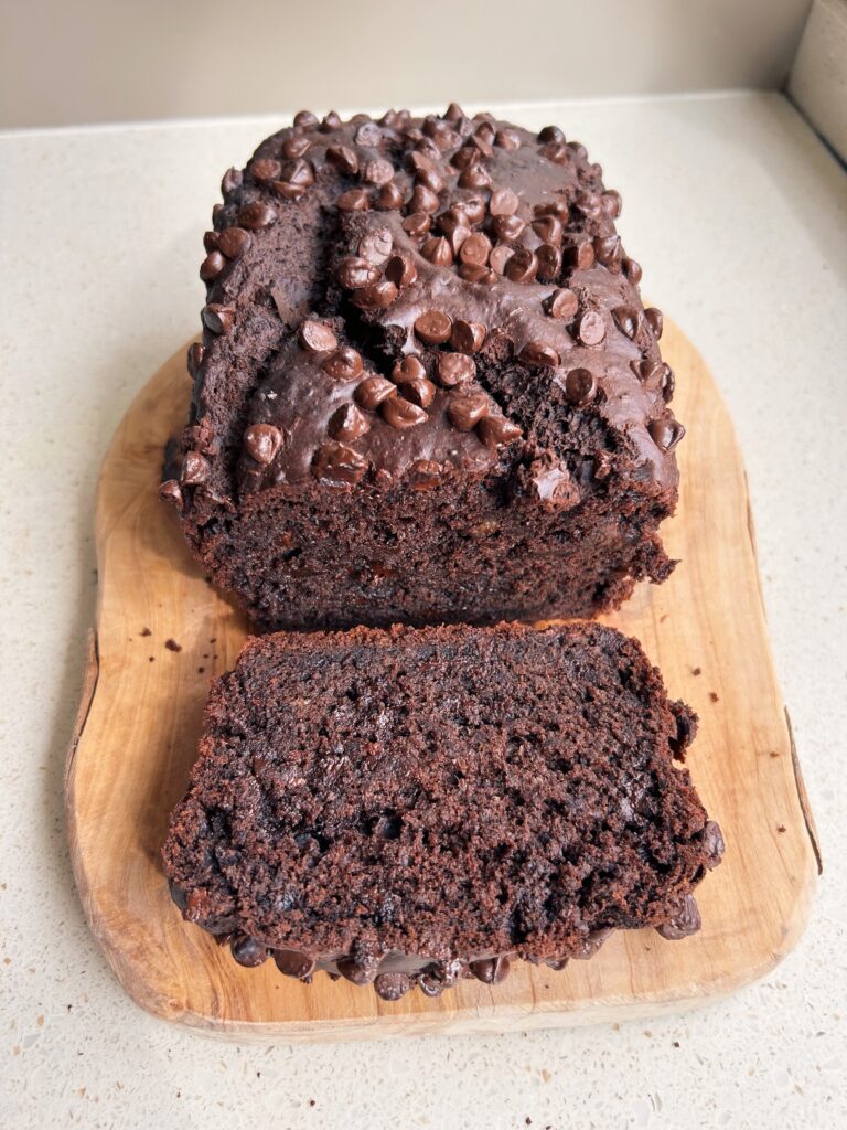 - Pour the batter into the lined tin. Sprinkle a few more chocolate chips on top and place in the oven to bake for 50-55 minutes or until a skewer comes out clean. Remove from the oven, let it cool in the tin for a few minutes before removing and slicing. Enjoy!