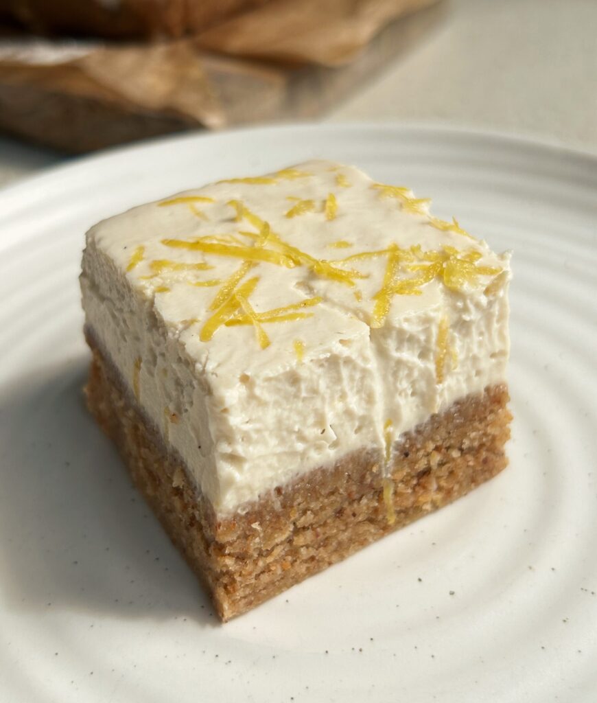 These Creamy Lemon Bars taste like a cross between a lemon cheesecake and a lemon mousse, but with a nutritious, high protein twist. They’re completely dairy free and vegan, and also gluten free. They’re simple to make and don’t require any baking.